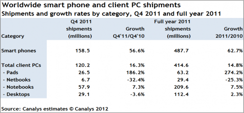 Впервые за все время, общий объем продаж ПК по всему миру отстает от общего объема продаж смартфонов, согласно данным, опубликованным в пятницу ведущим аналитиком рынка фирмой Canalsys. Было отгружено почти 488 млн смартфонов, по сравнению с (всего лишь!) 415 млн ПК.