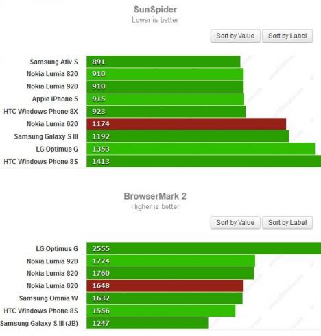 Новейший смартфон Nokia Lumia 620 еще не успел поступить в продажу, а многие издания уже сделали его предварительные обзоры. В одном из таких обзоров эксперты решили сравнить смартфон с другими аппаратами в “стандартных” браузерных бенчмарках — SunSpider and BrowserMark 2.