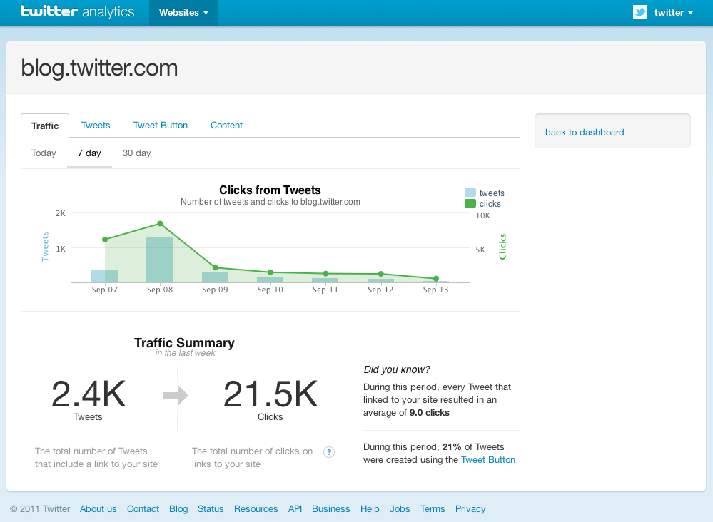 Сколько трафика получает ваш сайт благодаря Tвиттеру? Веб-аналитика Твиттера (Twitter Web Analytics) – это новый инструмент, представленный компанией во вторник, и призванный прийти на помощь владельцам сайтов и блогов – для тех, кто полагается на сервис микроблоггинга при распространении контента.